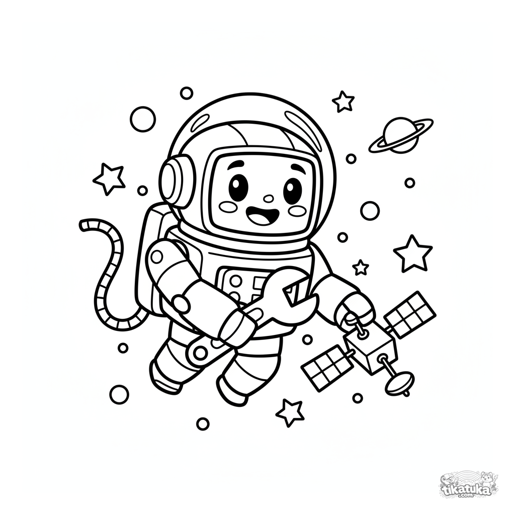 Simple coloring page for toddlers 2-5: a cute astronaut robot repairs a satellite in space. White background with stars and planets. Large outlines.
