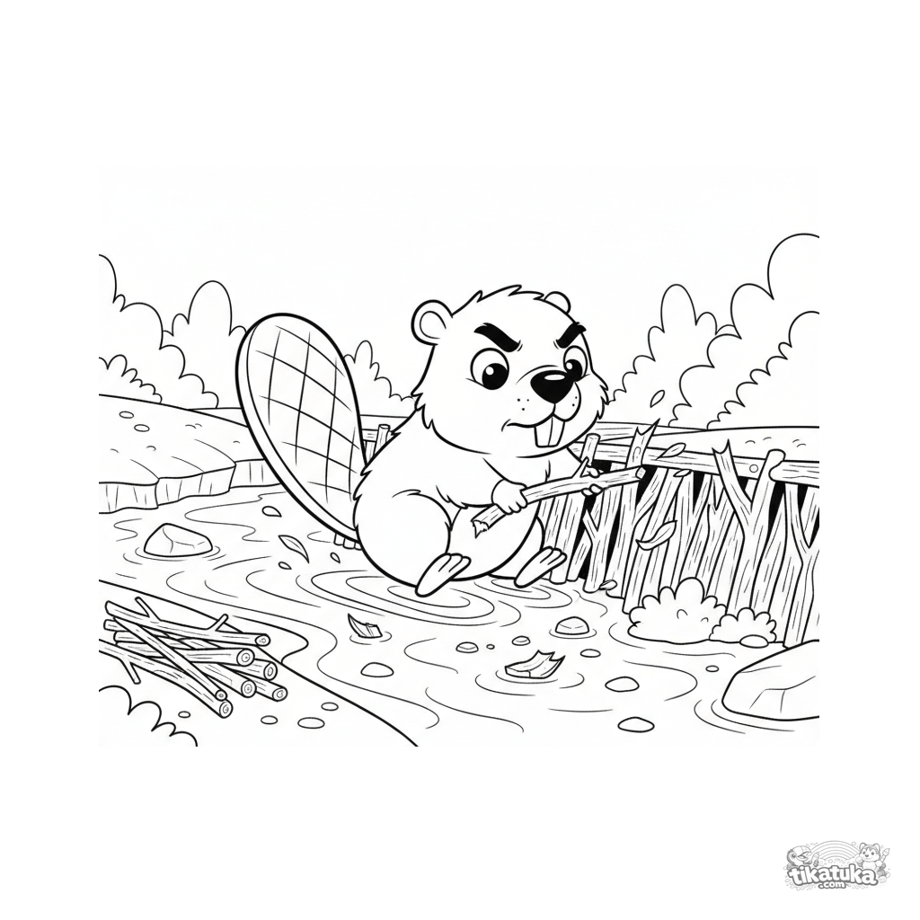 Coloring page for tweens 7-9: a hardworking beaver builds a stick dam in a stream. Dynamic pose, clear action, moderate detail level.