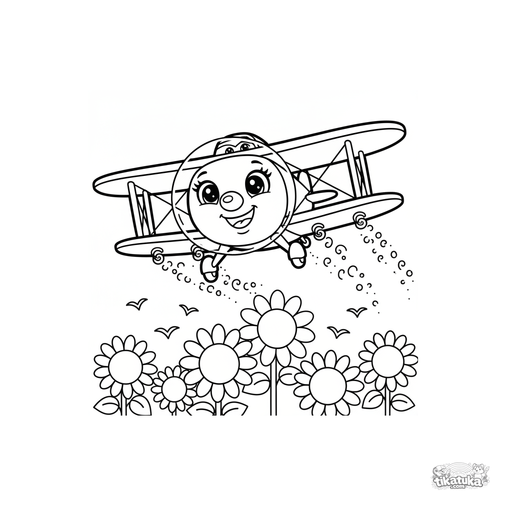 Simple coloring page of a cheerful crop-duster biplane with a smiling face, flying over a sunflower field. Large shapes for toddlers ages 2-3.