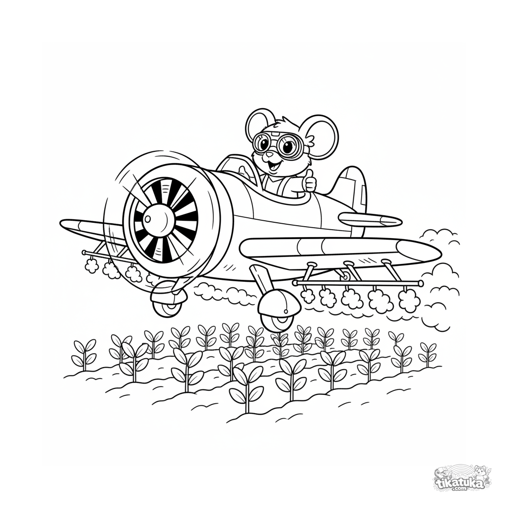 Coloring page of a cute crop duster plane flying low over a cornfield. A mouse pilot in goggles. For kids aged 4-6. Bright, simple chibi style.