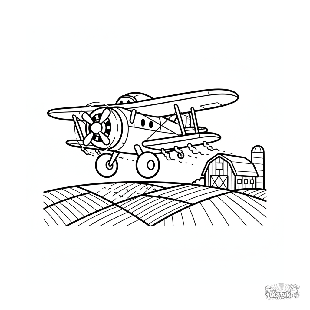 Coloring page of a cartoon crop duster airplane flying low over farm fields. For kids 7-9 years old. Bright design, recognizable rural scene.