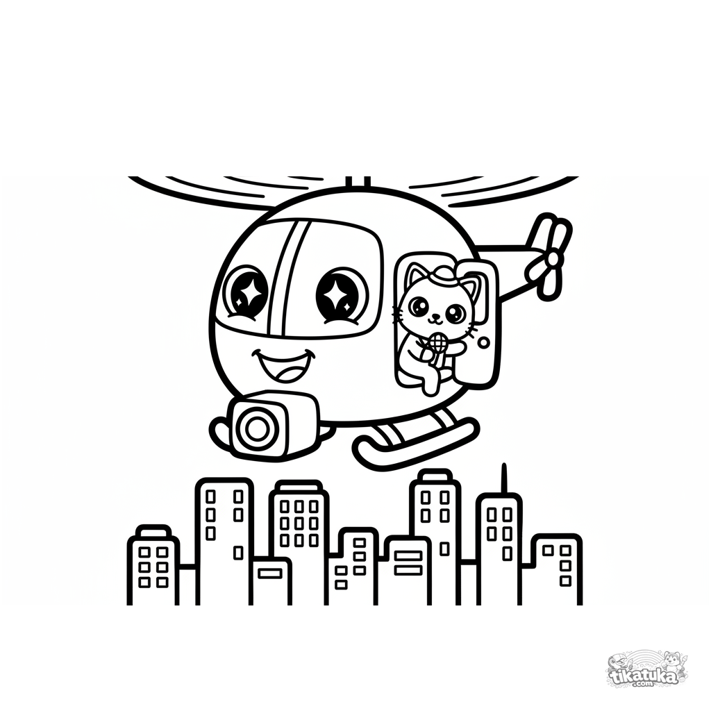 Toddler coloring page 2-3: a friendly cartoon helicopter hovers over a city. Very simple, large shapes, thick outlines, minimal details.