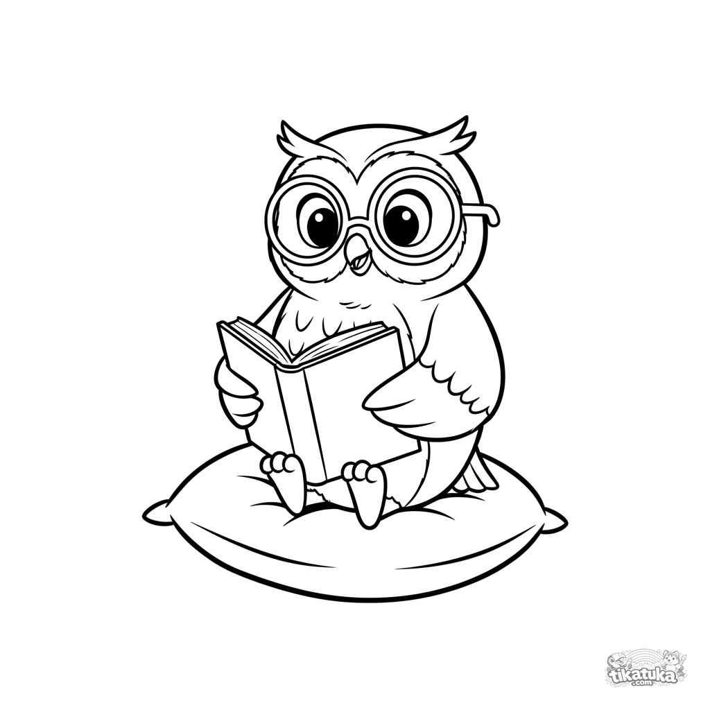 Cartoon coloring page in Disney style for toddlers: an owl with glasses and a book on a cushion. Flowing lines, simple shapes, for ages 2-3.