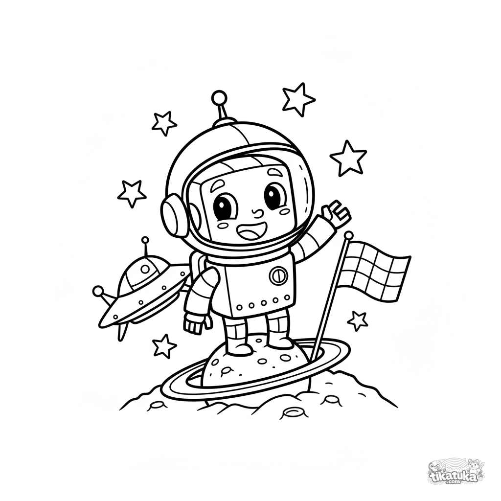 Coloring page of a friendly robot astronaut planting a flag on a ringed planet. For toddlers aged 2-5. A simple and fun space scene.