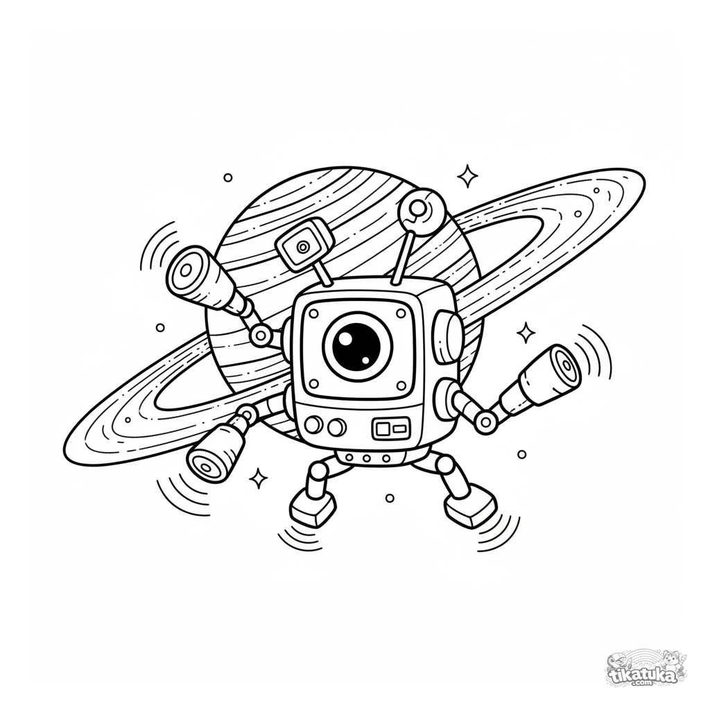 Coloring page for kids 4-6 on a space theme: a friendly robot probe explores the rings of a giant planet. Simple shapes and clear outlines on a white background.