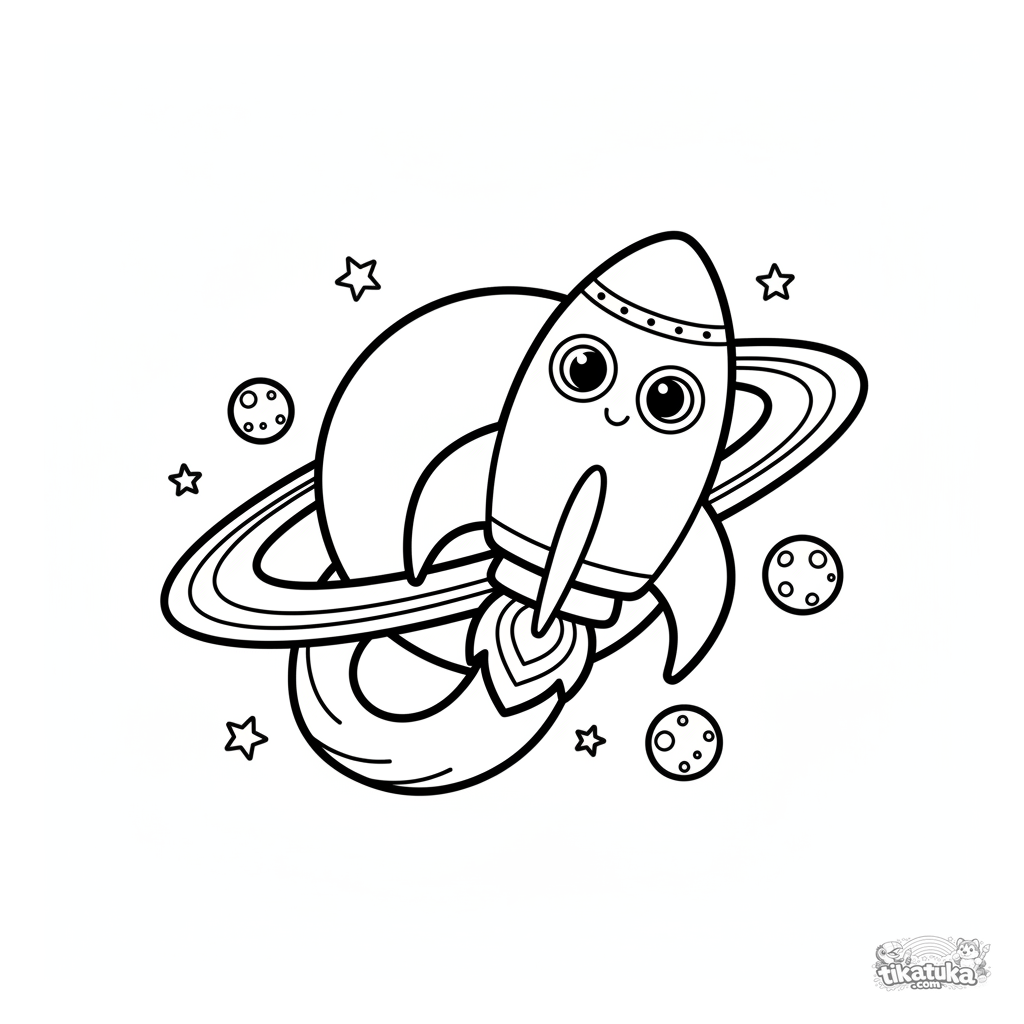 Toddler coloring page 2-3: a friendly rocket with window eyes flies around a big ringed planet. Extremely simple outlines, large details, perfect for little hands.