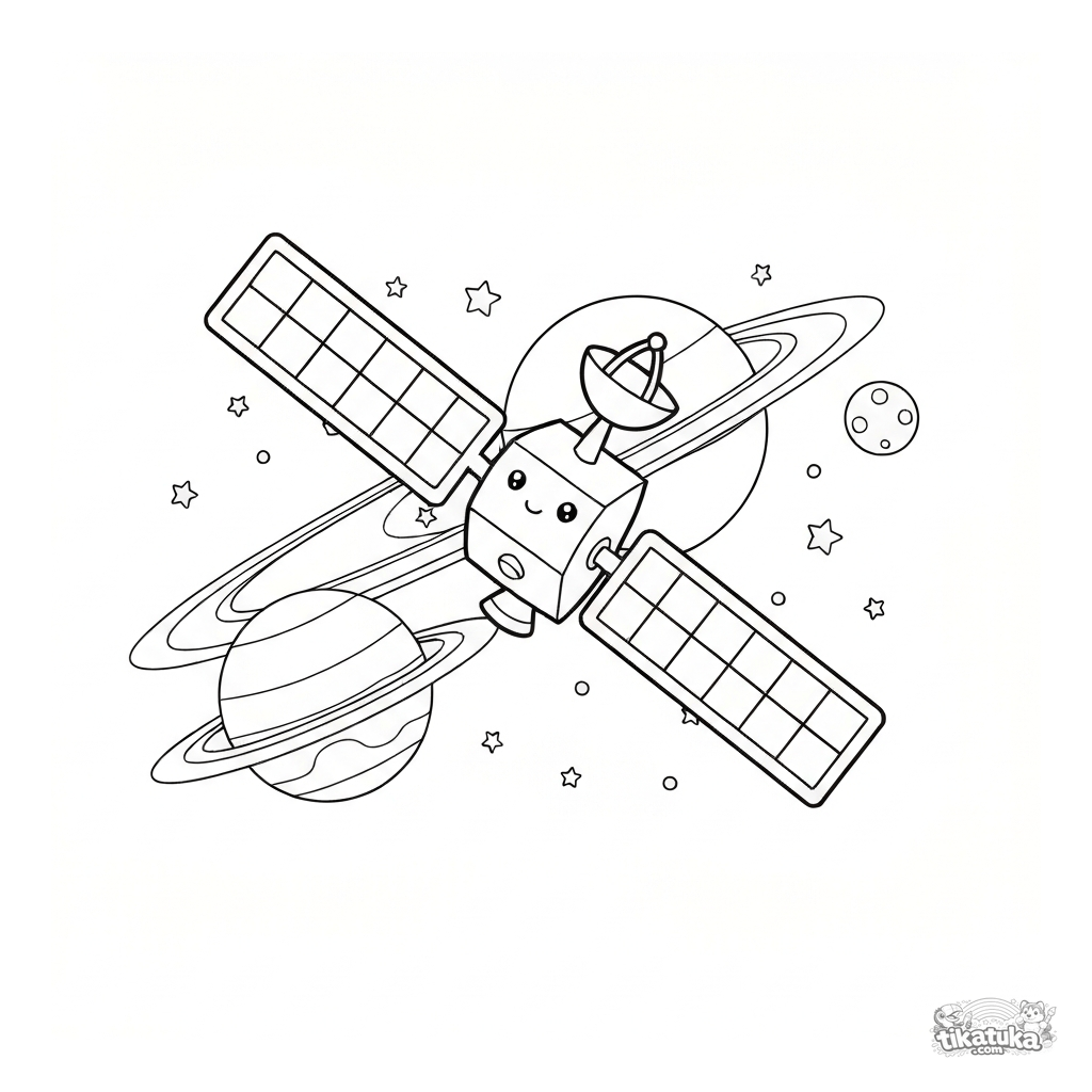 Simple coloring page for toddlers: a satellite in space. A friendly satellite with solar panels orbits a ringed planet. For kids aged 2-5.