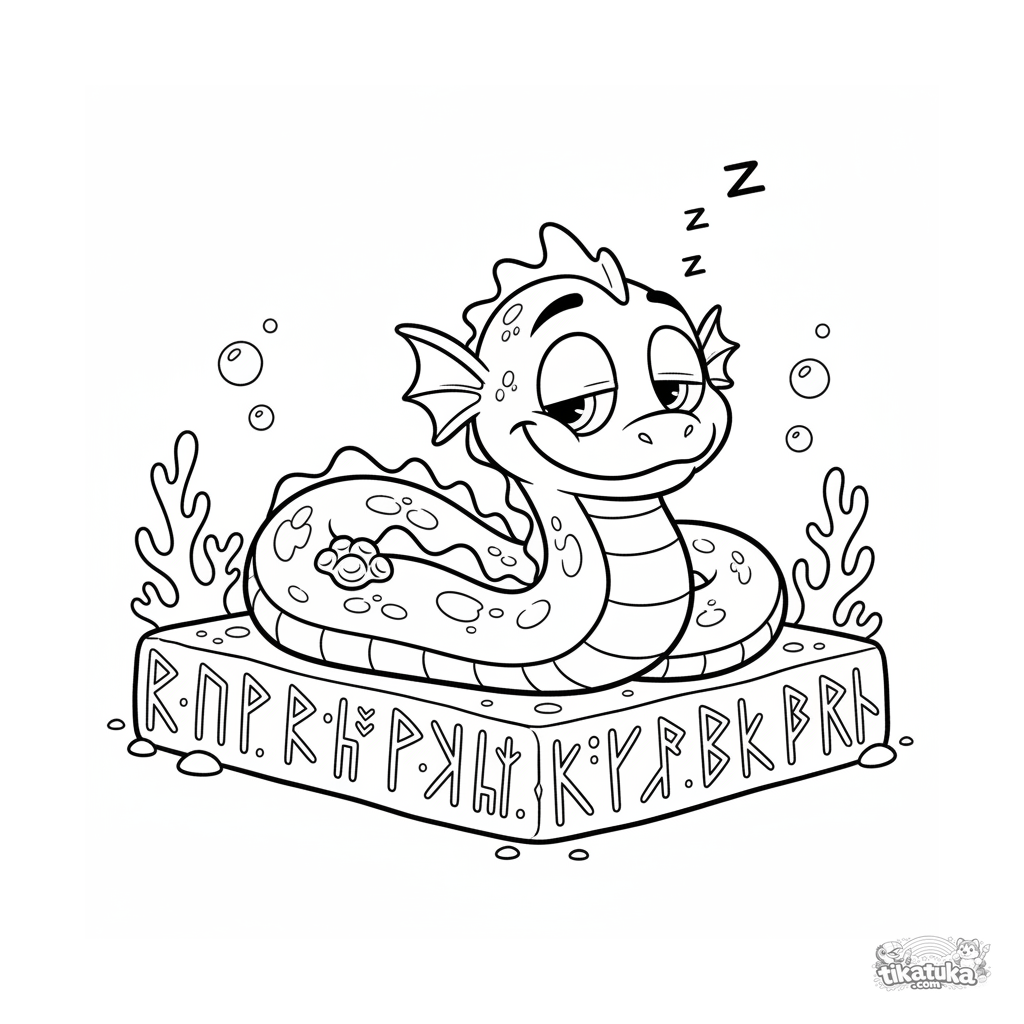 Fun coloring page for kids 4-6: a friendly sea serpent snoozes soundly, coiled up on an ancient runed slab. Goofy expression, simple shapes.