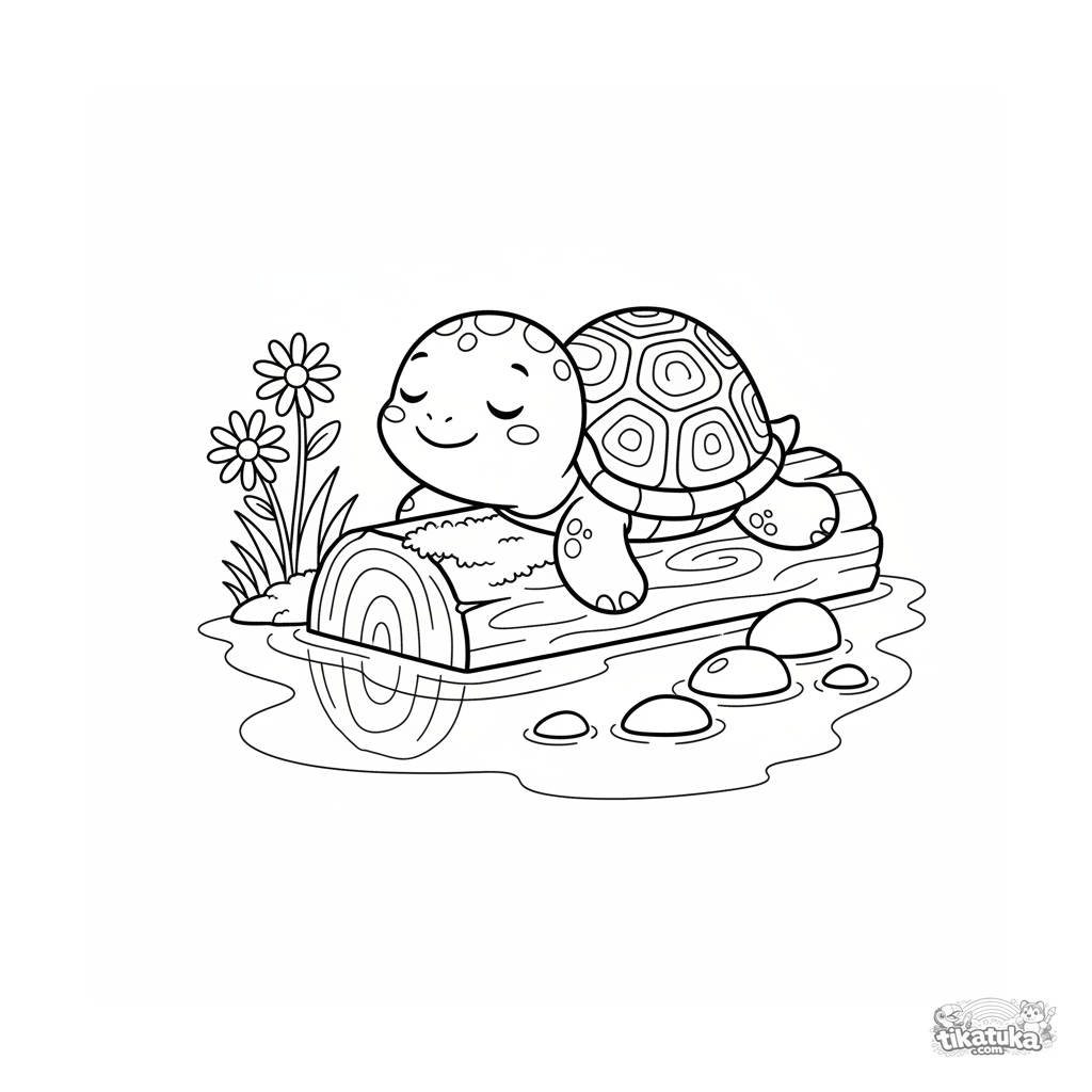 Coloring page for kids 4-6: a cute turtle sunbathes on a mossy log by a quiet stream. Sweet expression, simple background, great for beginners.
