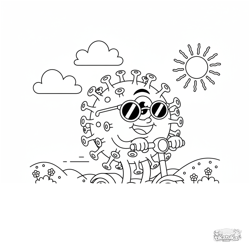 Coloring page of a cheerful cartoon virus microbe with sunglasses riding a scooter. For kids aged 4-6. Fun and educational scene.