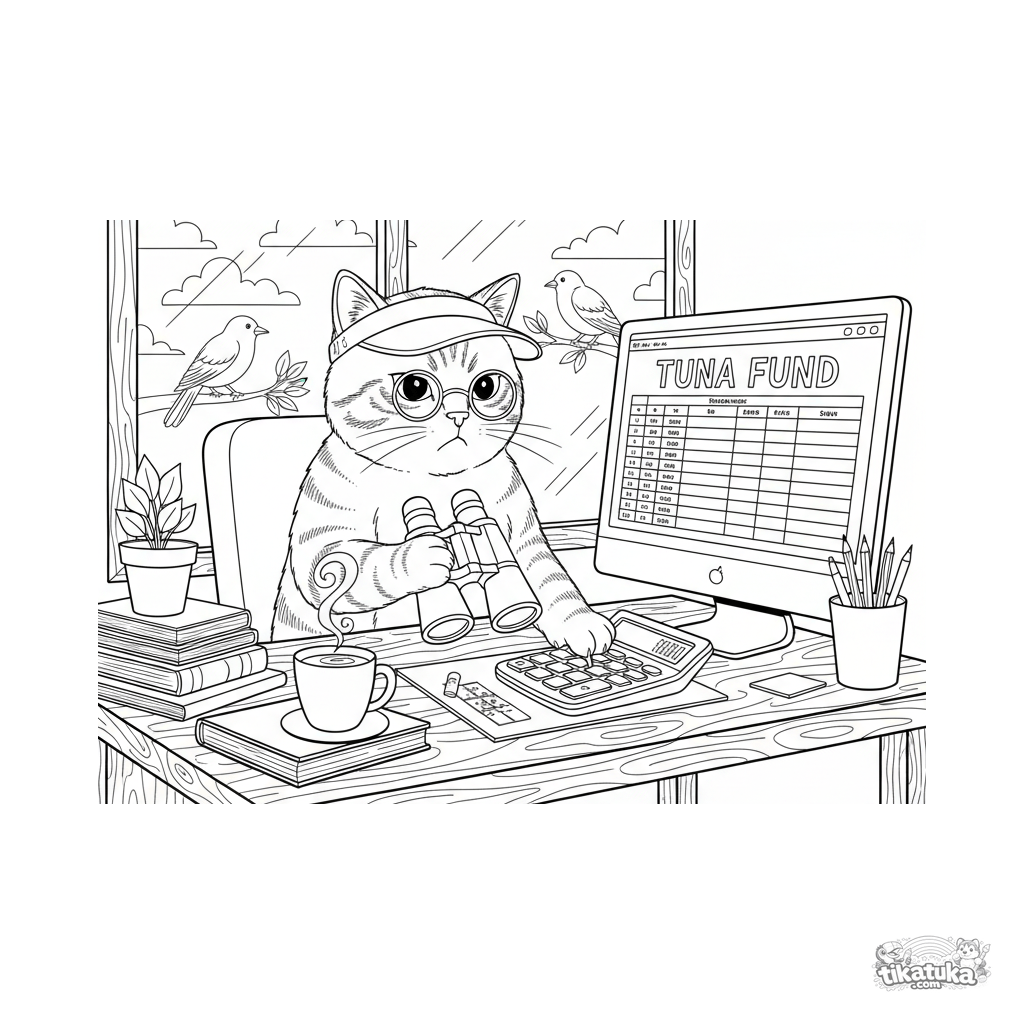 Coloring page for kids 10-12: a stern cat accountant with glasses at a window, calculating on a calculator and peering through binoculars at a 'Tuna Fund' spreadsheet. Detailed humorous illustration.