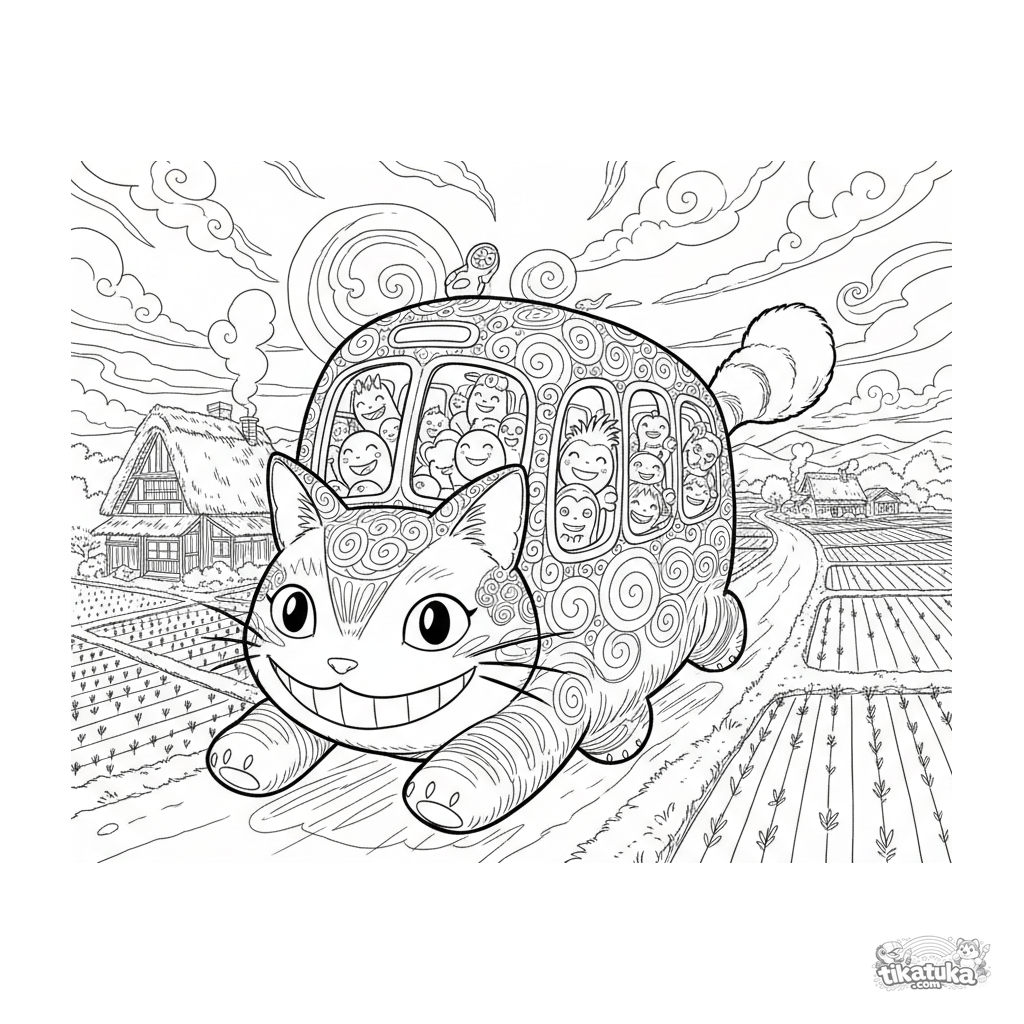 Watercolor-sketch anime coloring page: a joyful cat bus races down a rural road at sunset. A detailed scene with rice fields, houses, and spirit passengers for ages 10-12.