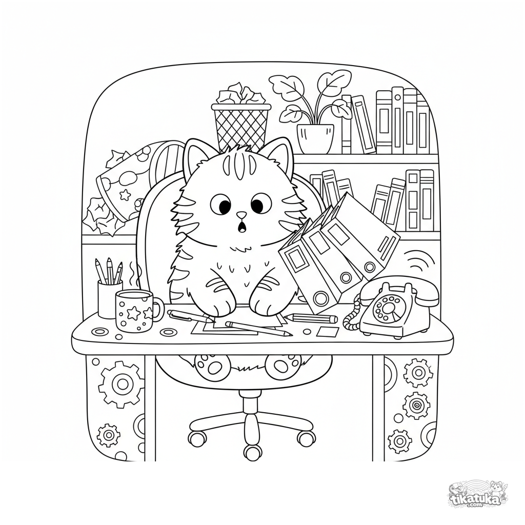 Coloring page for kids 7-12: a confused cat in a swivel chair stares at a stack of folders and a ringing phone in an office. A funny and relatable scene.