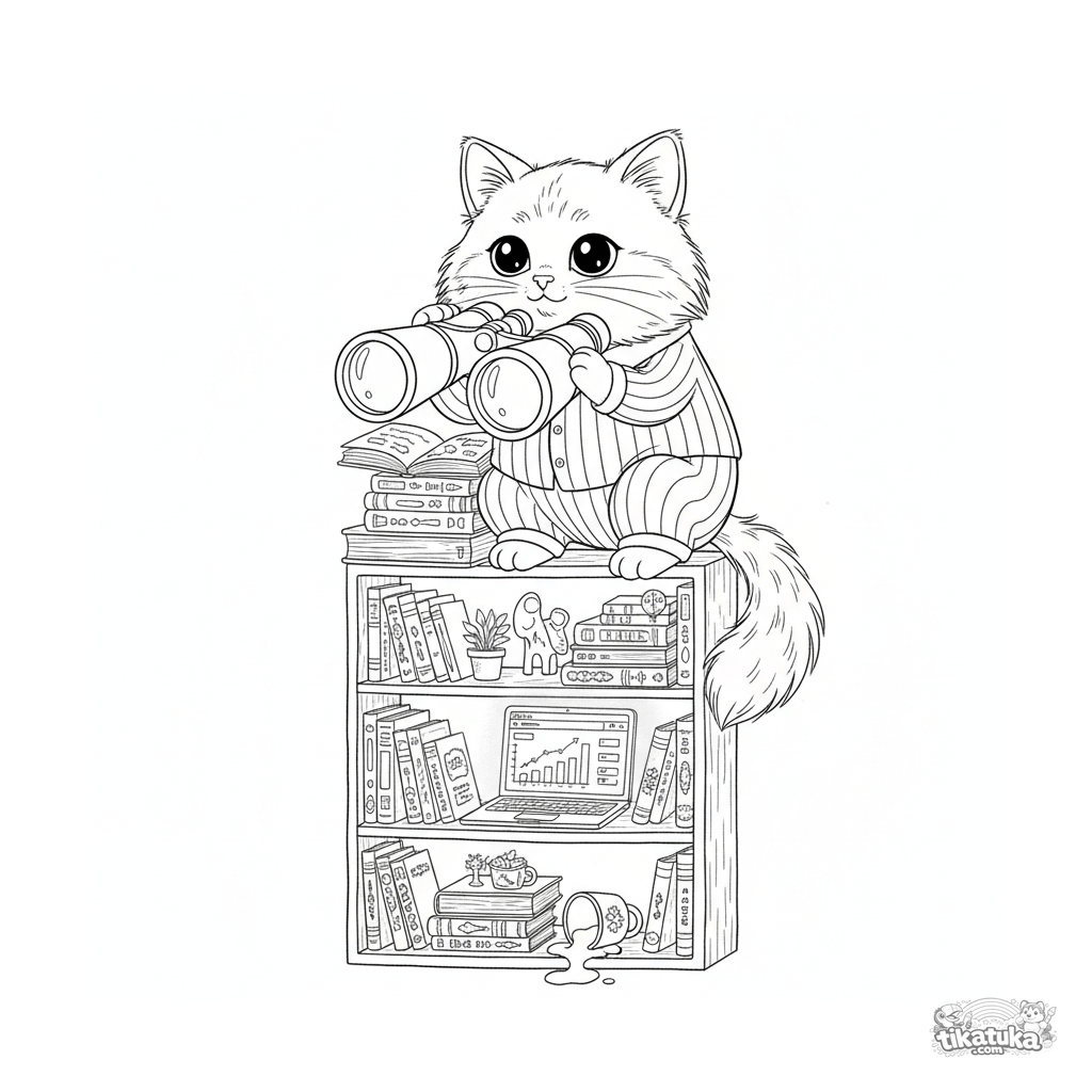 Coloring page for kids 10-12: a fluffy cat in pajamas on a bookshelf with binoculars looks for payday on a laptop screen. Detailed funny scene.