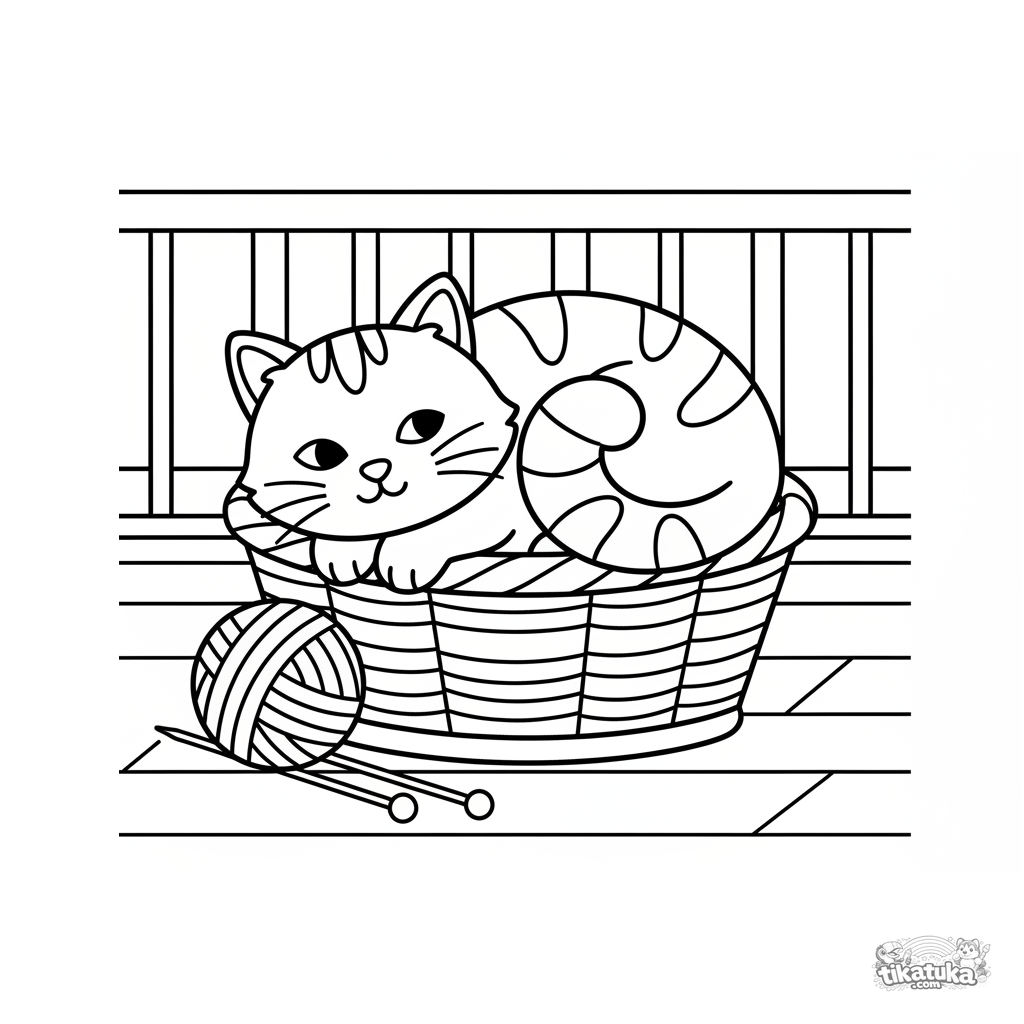 Very simple coloring page for toddlers 2-3: a fluffy cat sleeping soundly in a basket on a sunny veranda. Large shapes, minimal details, perfect for first coloring.