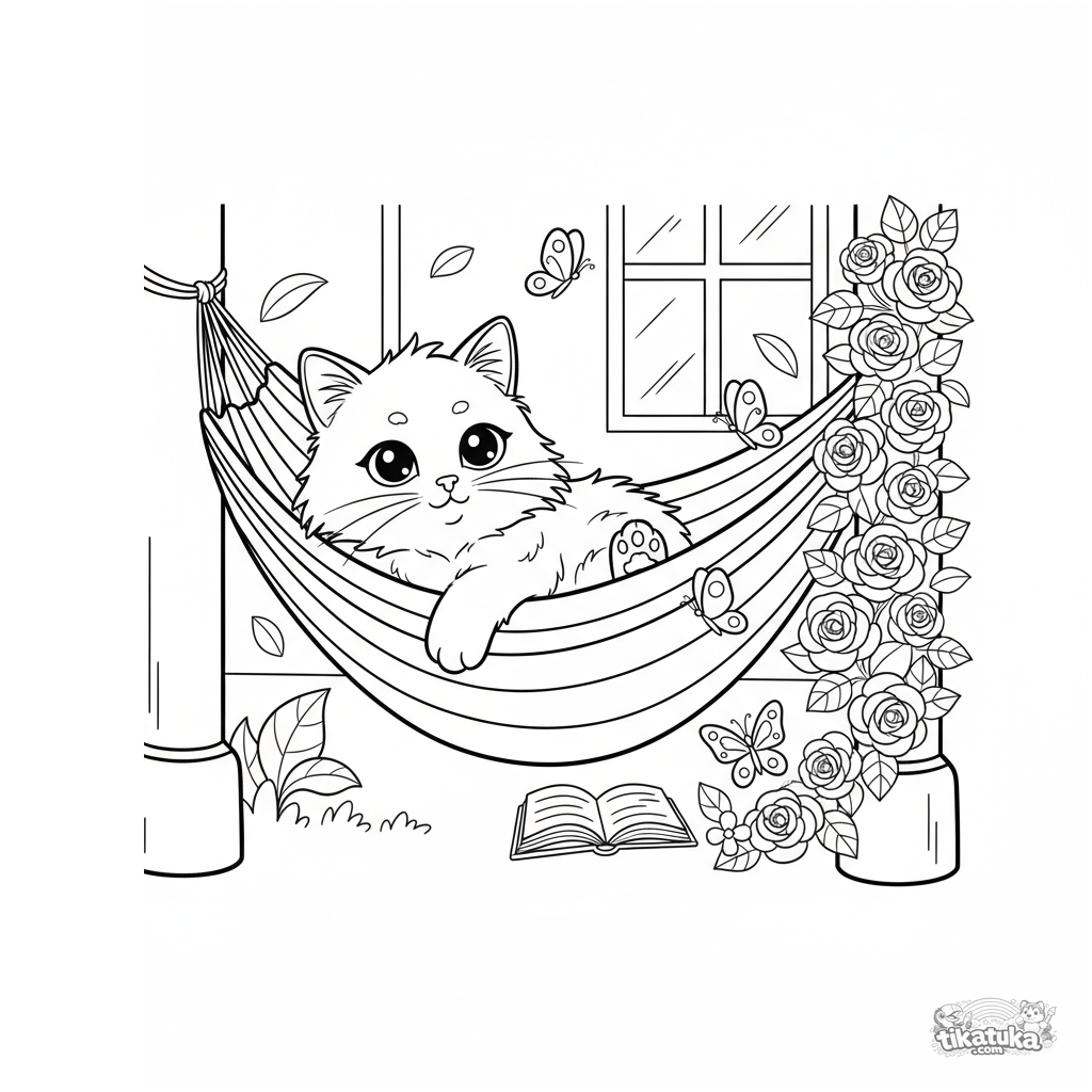 Coloring page for kids 4-6: a fluffy cat relaxes in a hammock on the porch watching butterflies. A cute and calm scene with simple details to color.