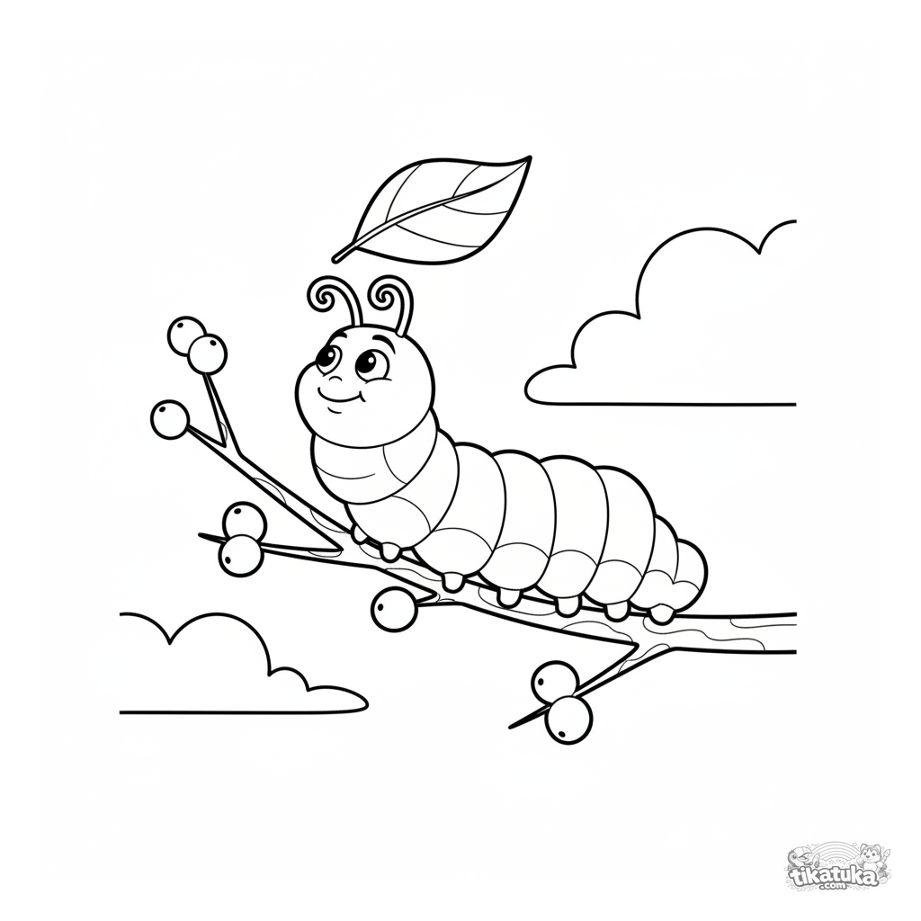 Coloring page for kids 4-6: a plump caterpillar crawling on a berry-covered branch. Moderate detail, realistic style, develops fine motor skills.