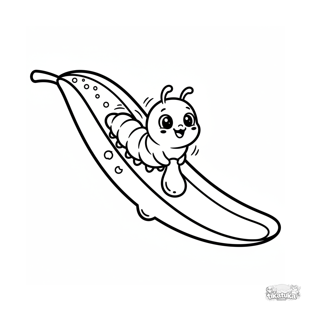 Simple, cute coloring page for toddlers 2-3: a kawaii-style caterpillar happily slides down a dewdrop like a slide on a big leaf. Very simple outlines.