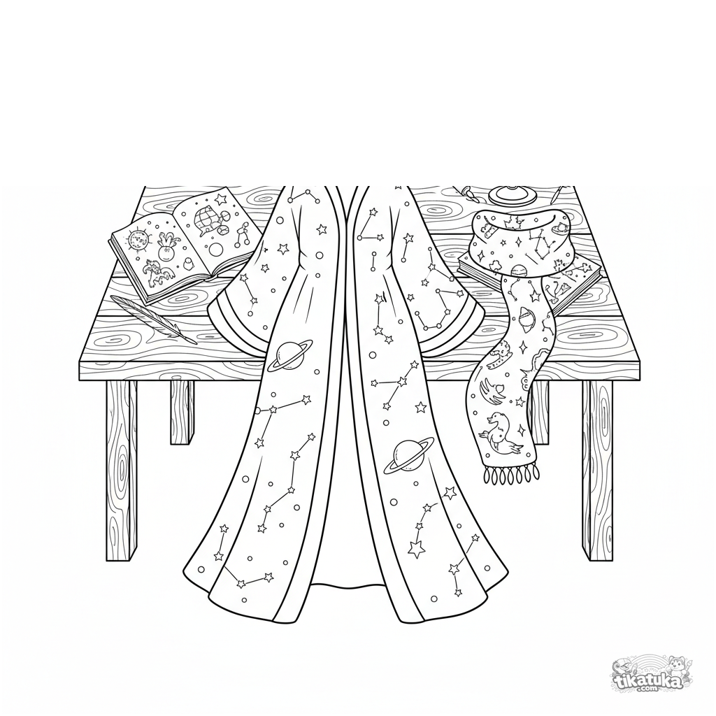 Detailed coloring page for ages 10-12: a magical constellation-embroidered robe laid flat on an observatory desk among books and astronomical instruments.