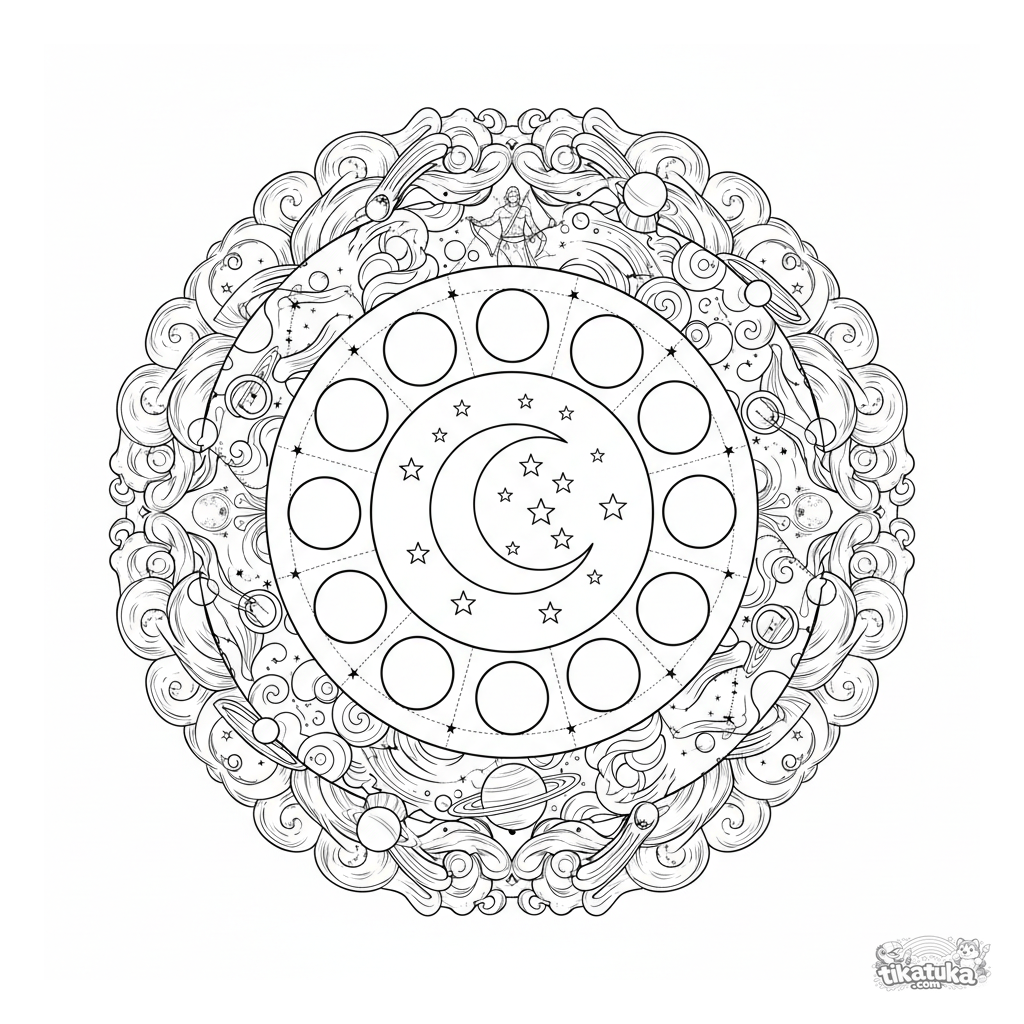 Detailed celestial mandala coloring page for ages 10-12. Depicts the moon, stars, moon phases, constellations, and planets in a symmetrical circular pattern.