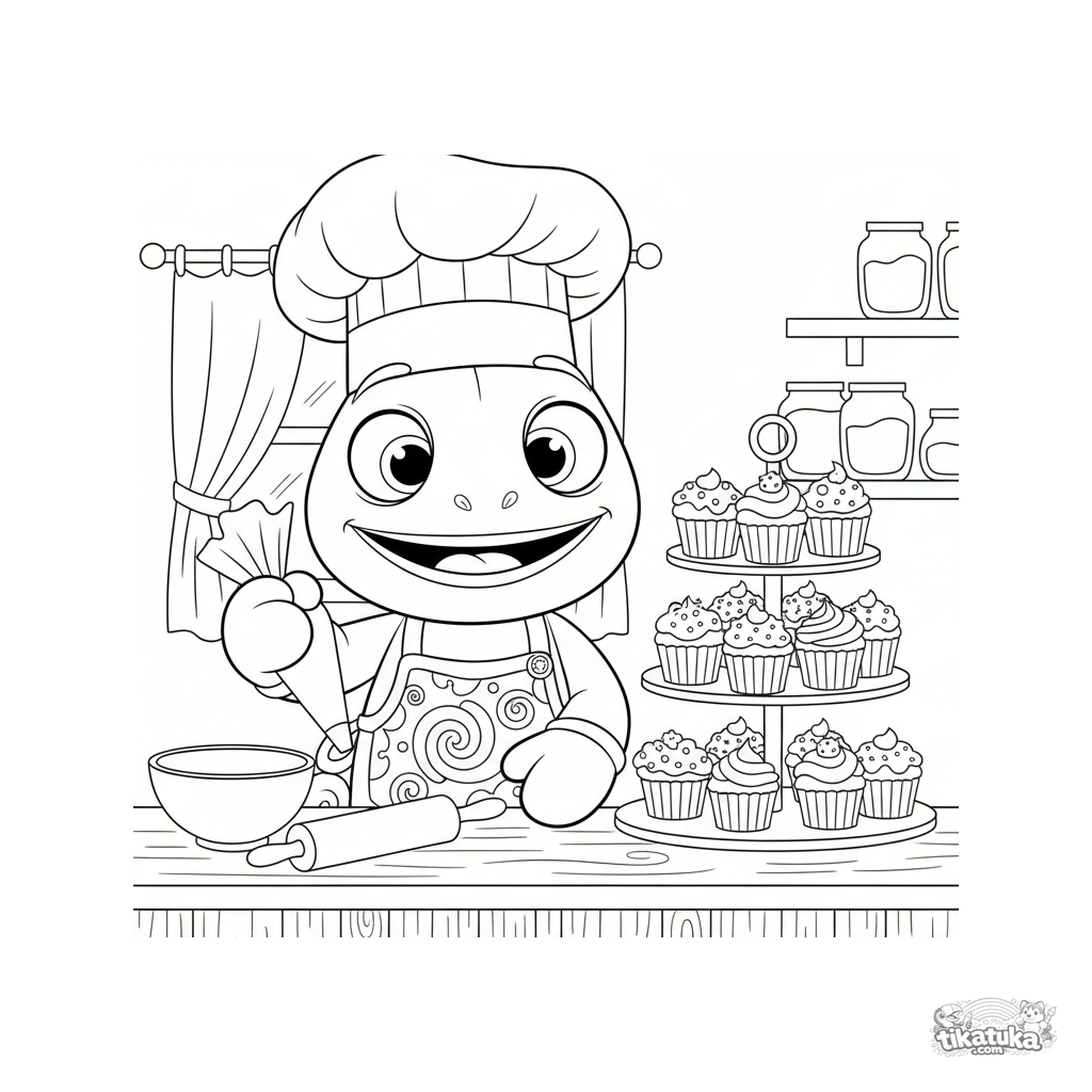 Coloring page for kids: chameleon Radik in a chef's hat decorates a tower of cupcakes. Cute character, simple shapes, for ages 4-7.