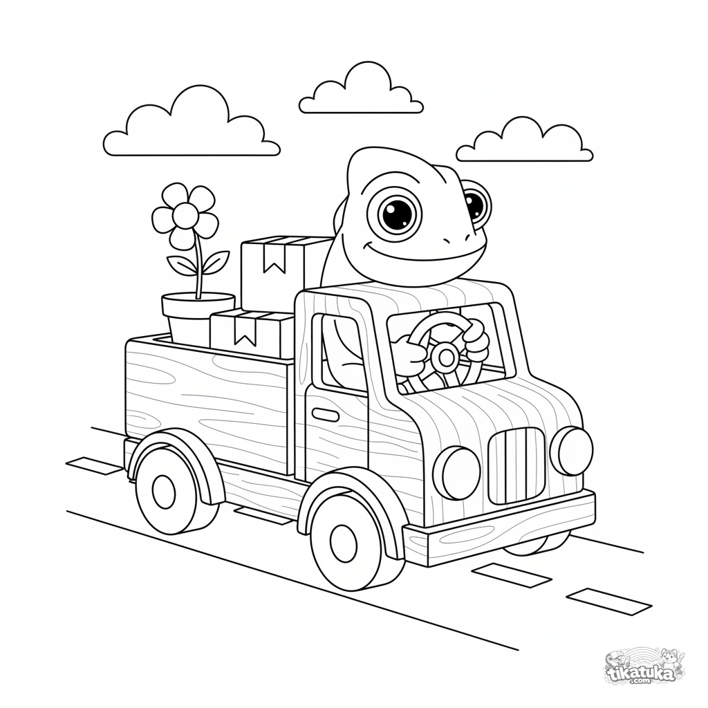 Vehicle coloring page for boys 4-6: chameleon Radik drives a wooden toy delivery truck with packages. Clear geometric shapes, recognizable vehicle, simple background.