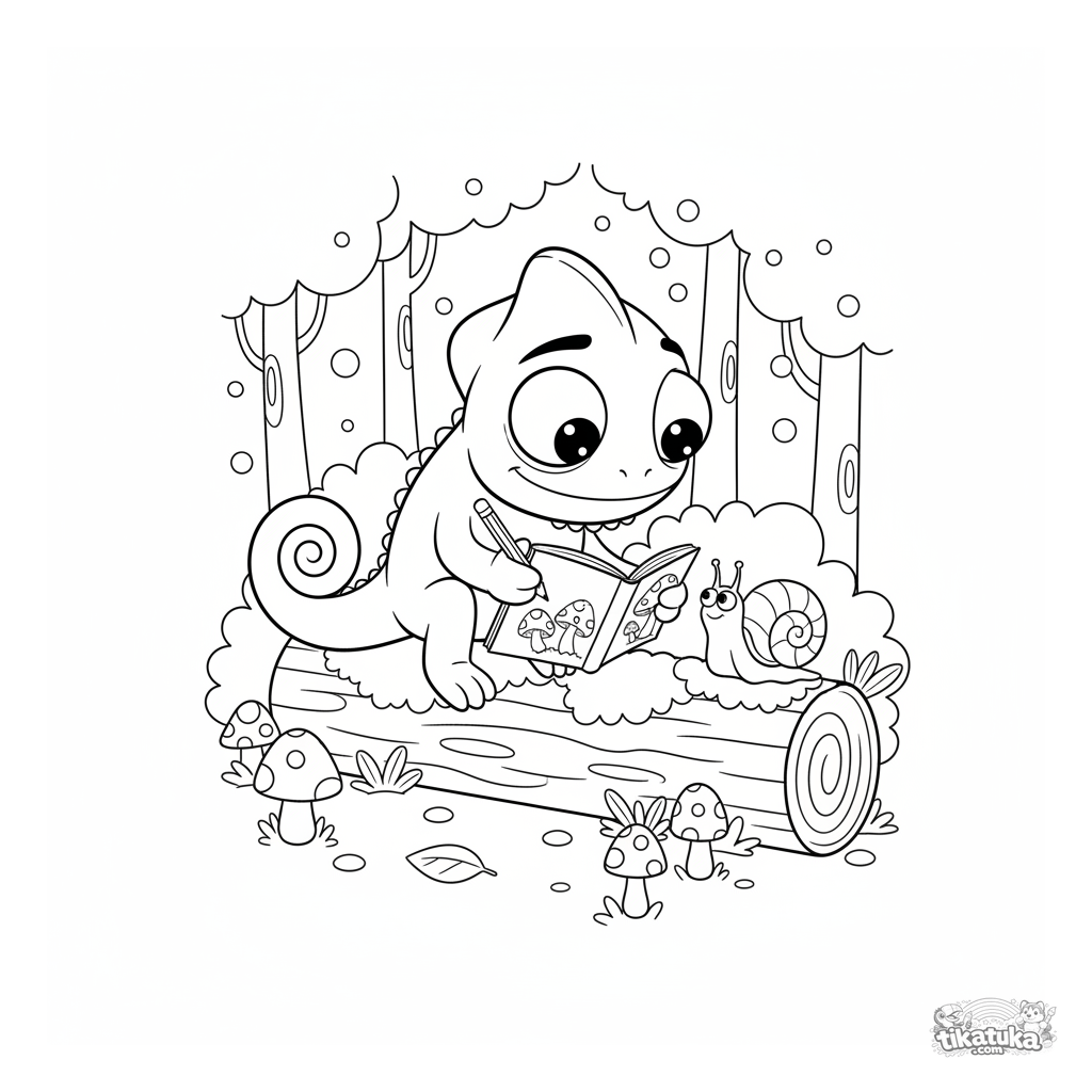Coloring page for kids 4-6. Cute chameleon Radik draws mushrooms in the forest. Scandinavian plush style, clean lines, wide margins for coloring.