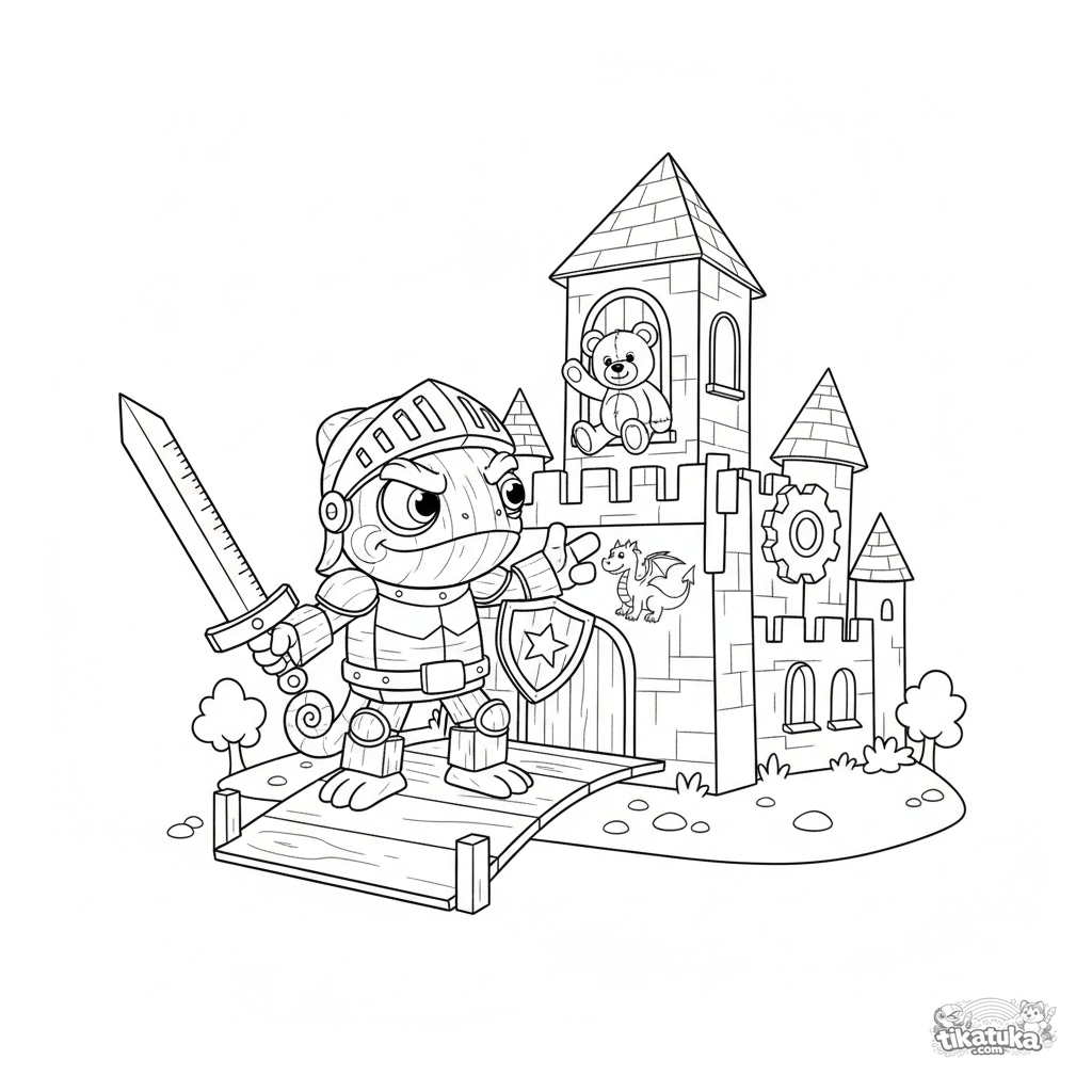 Coloring page for boys 4-6. Chameleon Radik as a knight rescues a teddy bear from a cardboard castle. Wooden toy style, simple shapes, wide margins.