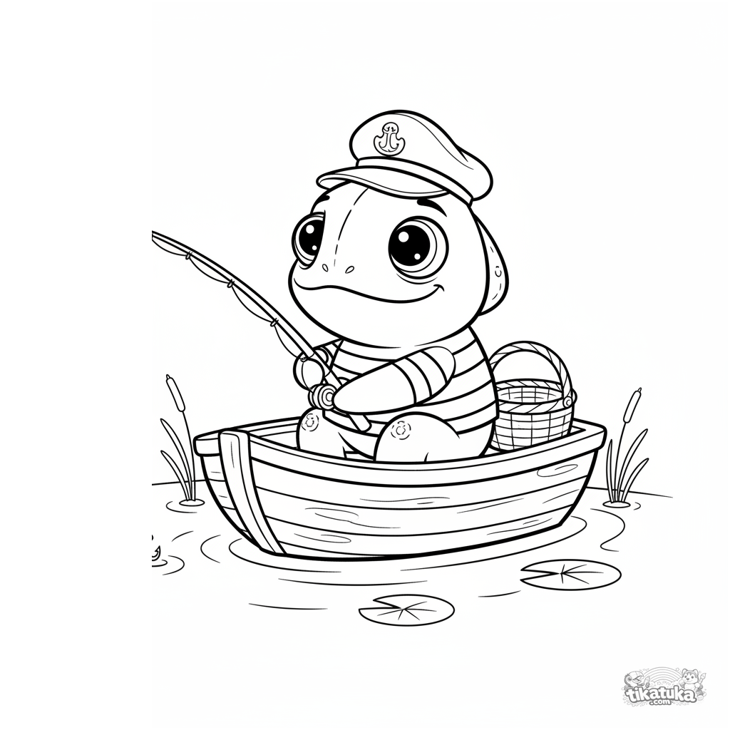 Kids coloring page: chameleon Radik fishing from a rowboat on a calm pond. A peaceful and cute scene about relaxing on the water.