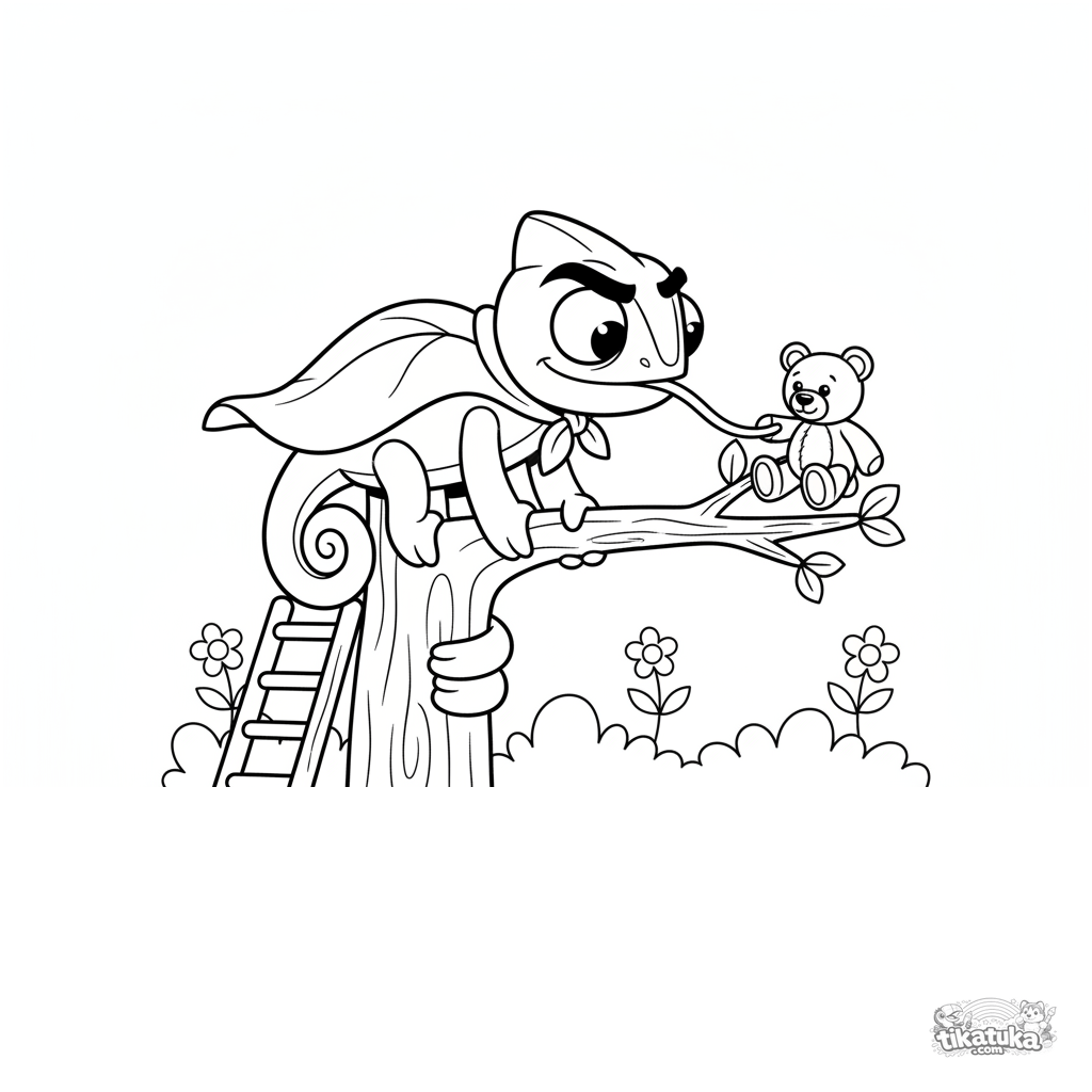 Coloring page for kids 4-6: chameleon Radik as a superhero rescuing a plush teddy from a tree. Geometric wooden toy style, dynamic pose, simple shapes.