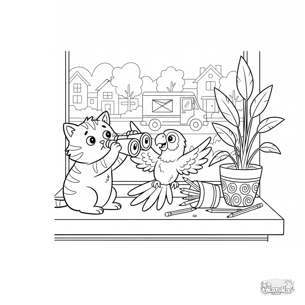 Coloring page for kids 10-12: a chaotic cat and parrot on a windowsill trying to share binoculars, knocking things over. Dynamic comic adventure scene.