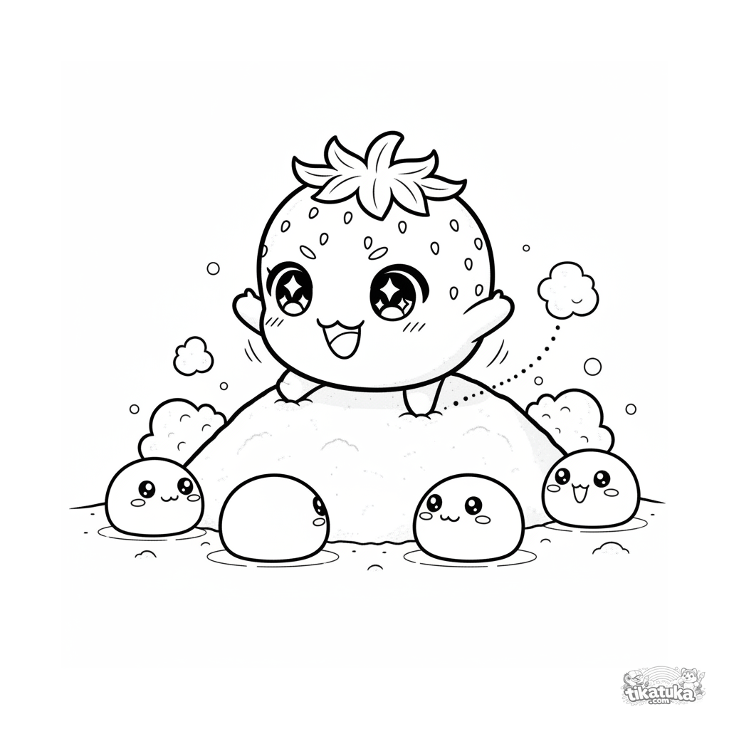 Coloring page for kids 4-6: a cheeky strawberry mochi happily rolling down a powdered sugar hill. A dynamic scene with cute emotions.
