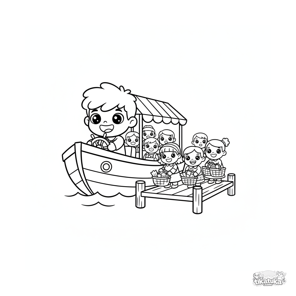 Simple coloring page for toddlers 2-3: a cheerful river ferry approaches a dock. Large simple shapes, few details, perfect for first crayons.