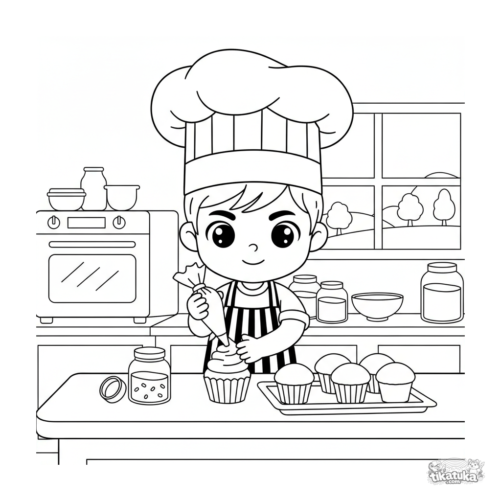 Coloring page for boys: a young chef. For kids 3-6. A boy in a hat and apron carefully decorates a cupcake with whipped cream in a bakery kitchen.