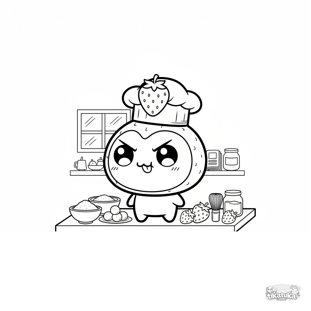 Coloring page of a chef mochi balancing a strawberry on its head. For tweens aged 7-9. Features a kitchen counter, ingredients, and a determined mochi in a hat.