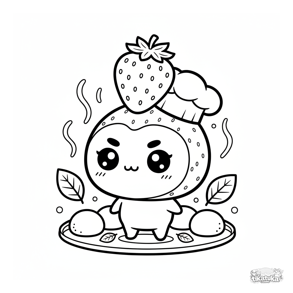 Coloring page for kids 4-6: a cute mochi in a chef's hat balances a strawberry on a tray. Fun scene among other mochi for creative coloring.