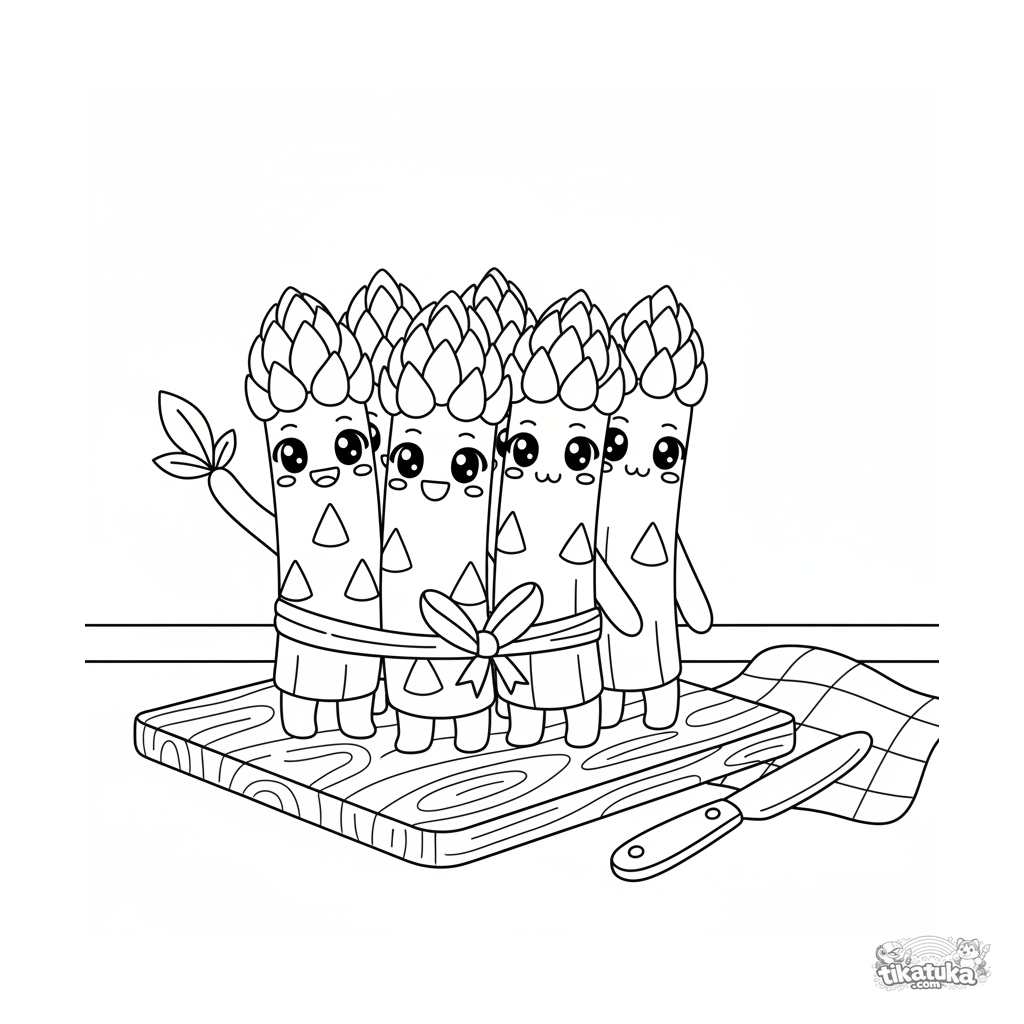 Coloring page for ages 4-6: a cheerful bunch of asparagus in chibi style with smiling faces on a cutting board. Cute and simple design.