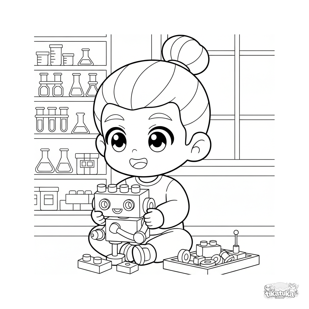 Coloring page for kids 4-6 in chibi style: a cute boy in a secret laboratory assembles a tiny robot from large building block parts.
