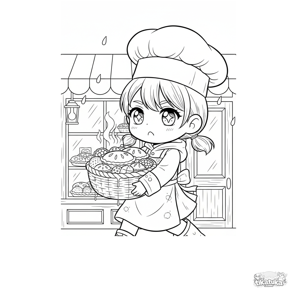 Coloring page for tweens 7-9: a chibi baker in rubber boots hurries to deliver pies through an autumn village in the rain.