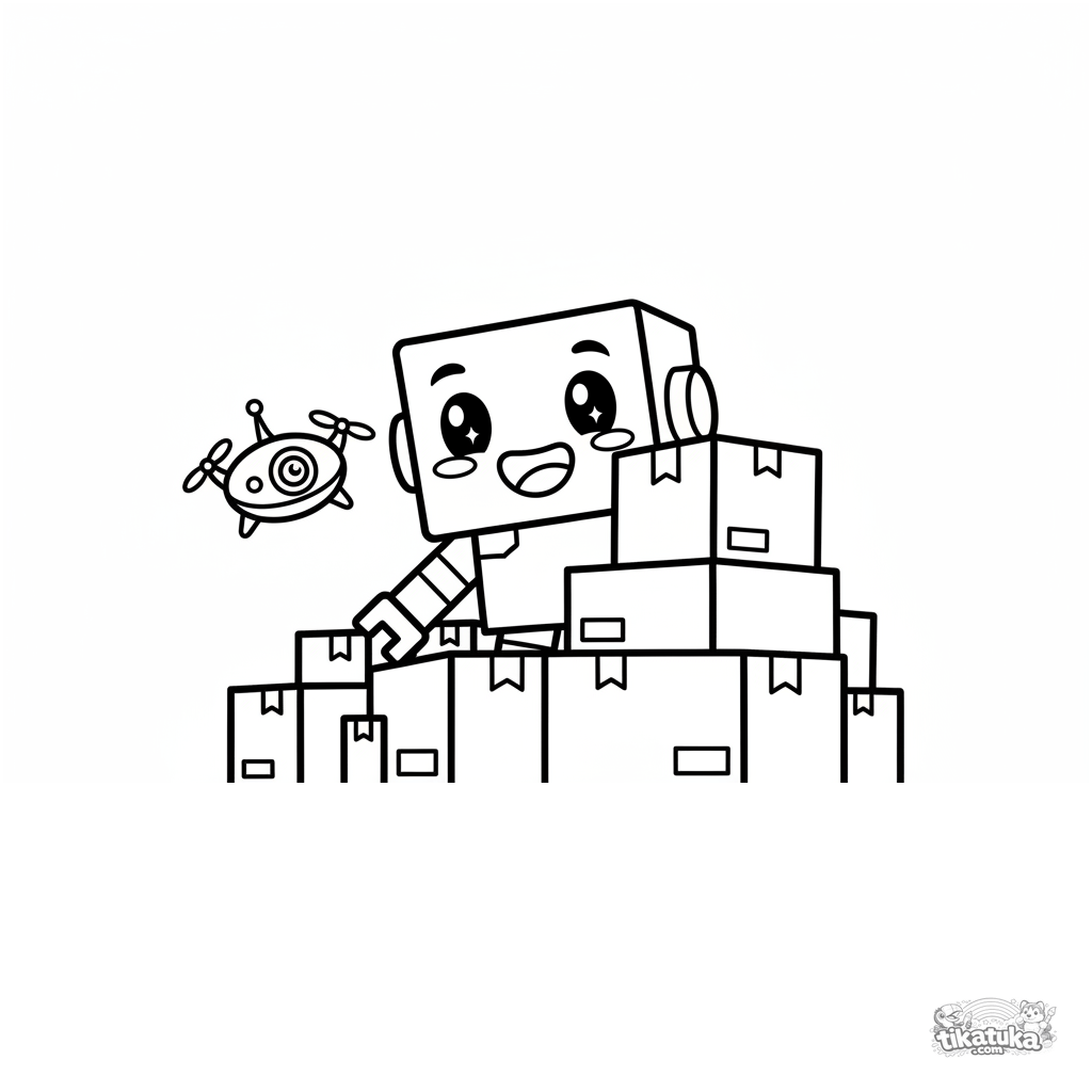 Simple coloring page for toddlers 2-3: a cute box robot playing hide and seek in a warehouse. Large shapes, very thick outlines, almost no background.