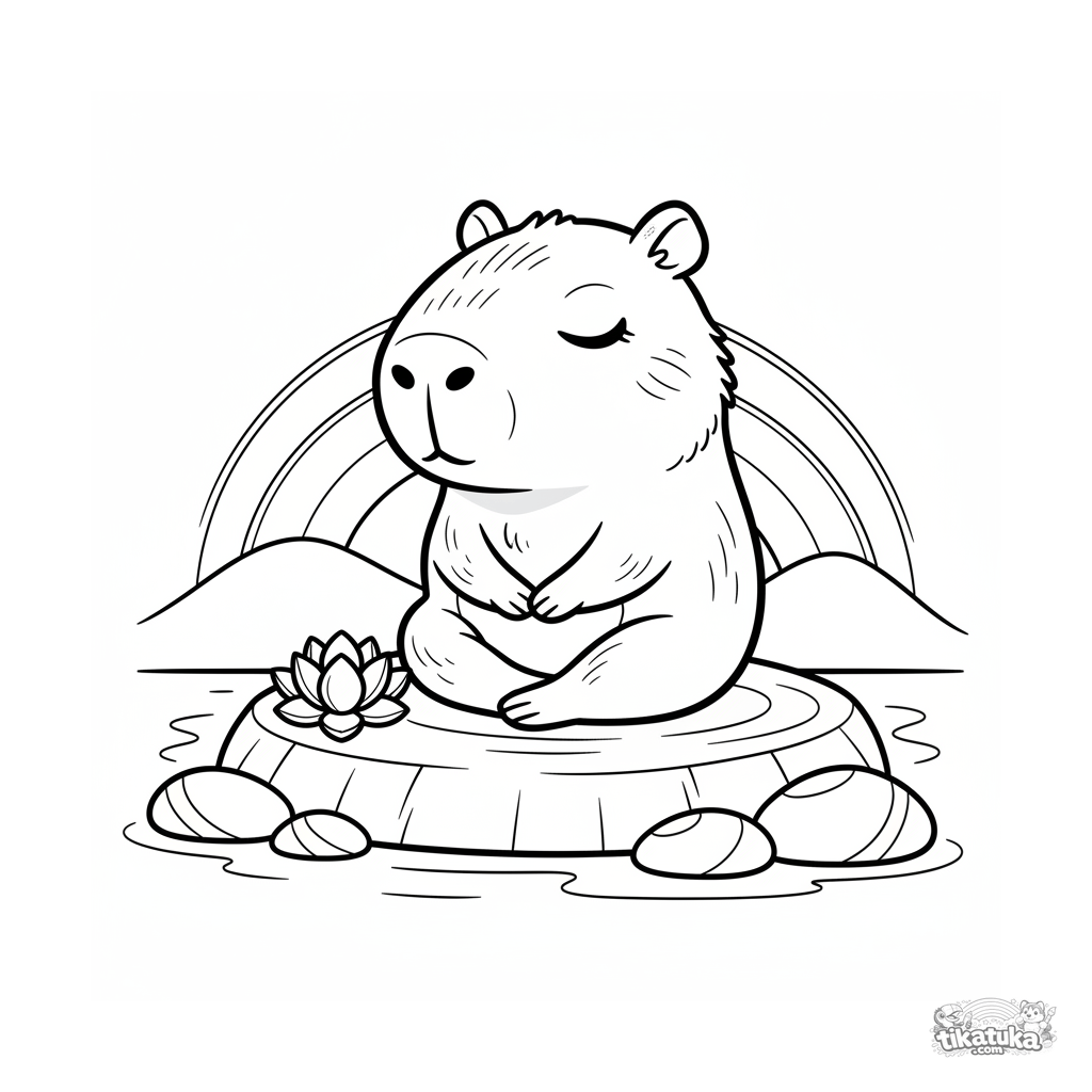 Coloring page of a cute chibi capybara meditating on a rock at sunset. For kids 4-6 years old. Simple and sweet scene.