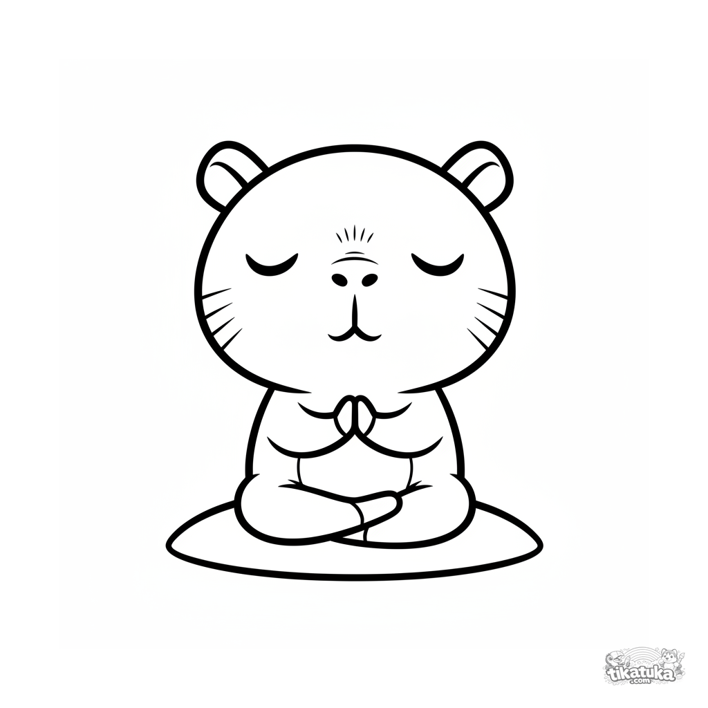 Simple coloring page for toddlers 2-3: a cute chibi capybara meditating in a yoga pose against a sunset. Large shapes, thick outlines.