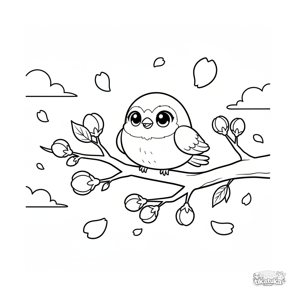 Cute coloring page of a cherry blossom branch with a bird in chibi style for kids 4-6. Falling petals, bird with big eyes, spring mood.