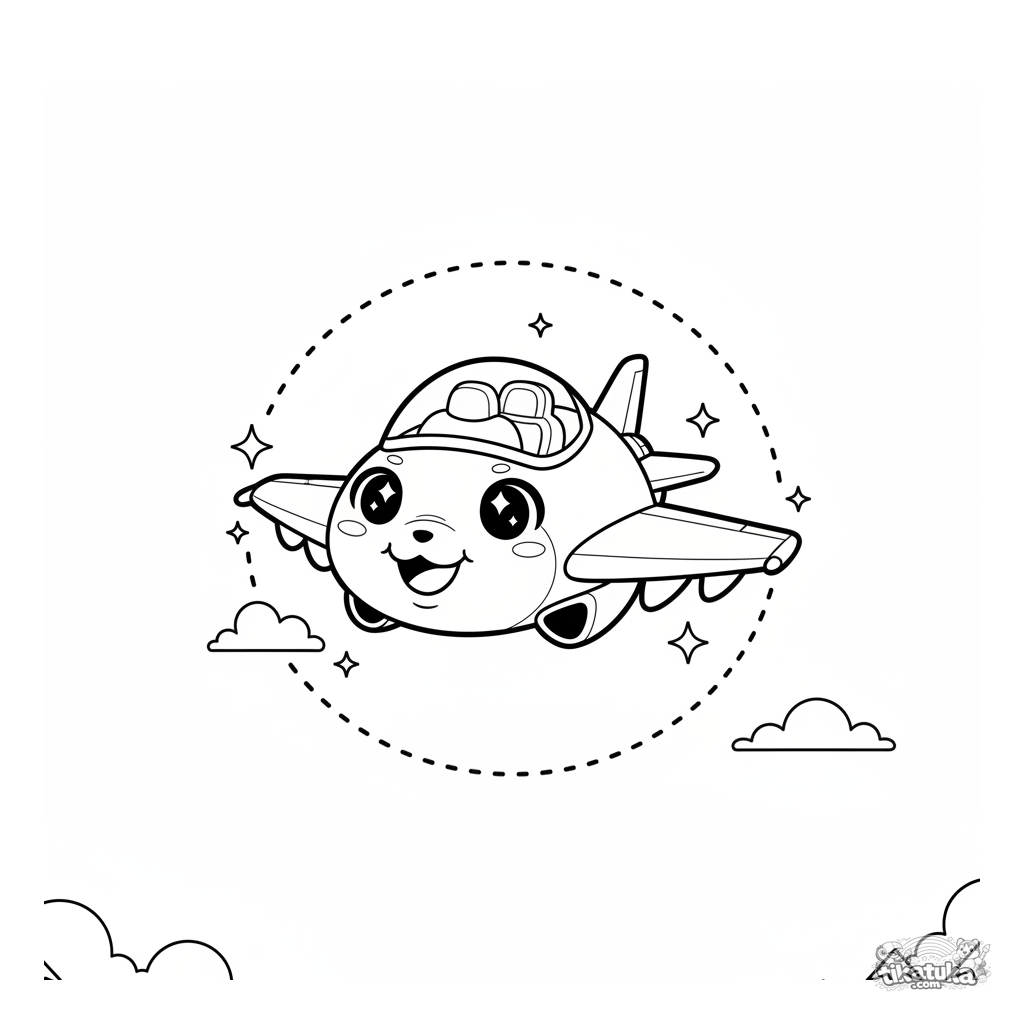 Fun coloring page of a fighter jet in cute chibi style, performing a loop-the-loop. For ages 4-6. Simplified shapes, smiling face, fluffy clouds.