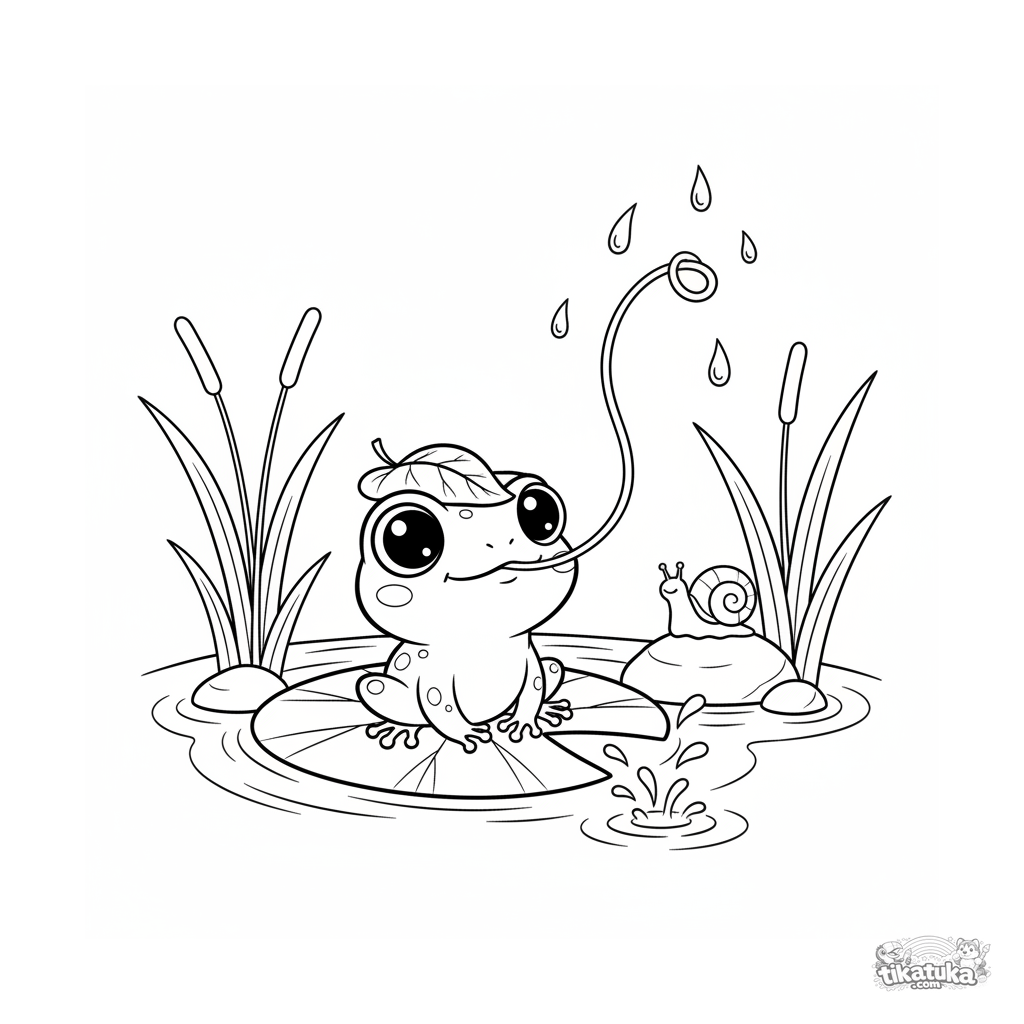 Kids coloring page (ages 4-6) in chibi style: a cute frog with a leaf hat sits on a lily pad catching raindrops with its tongue. Bright expressive eyes, simple composition.