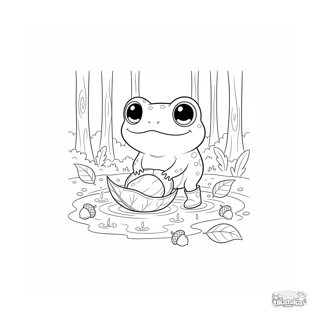 Cute coloring page for kids 4-6: a chibi-style frog in little boots plays with a leaf boat in an autumn puddle. Bright, simple shapes and a fun story.