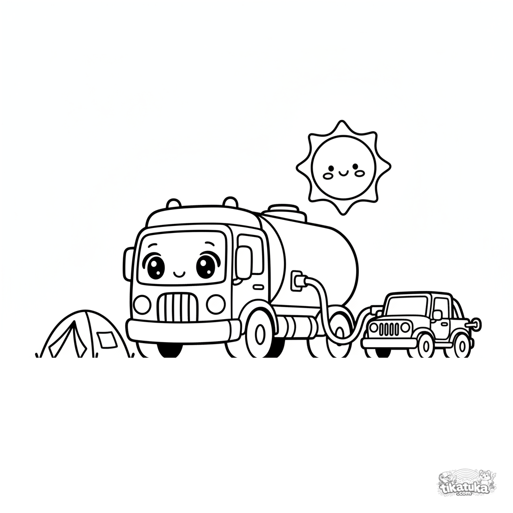 Cute chibi fuel tanker coloring page for toddlers 2-3 years. A smiling truck refuels a jeep near a tent. Very simple and large shapes.