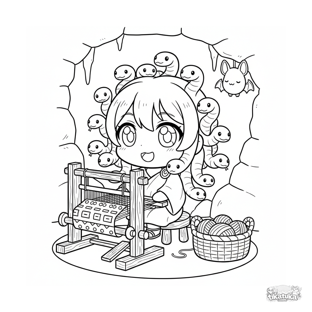 Coloring page for kids 4-6: a cute chibi Gorgon sister weaves cloth at her loom inside their stone home. Simple shapes, friendly character.