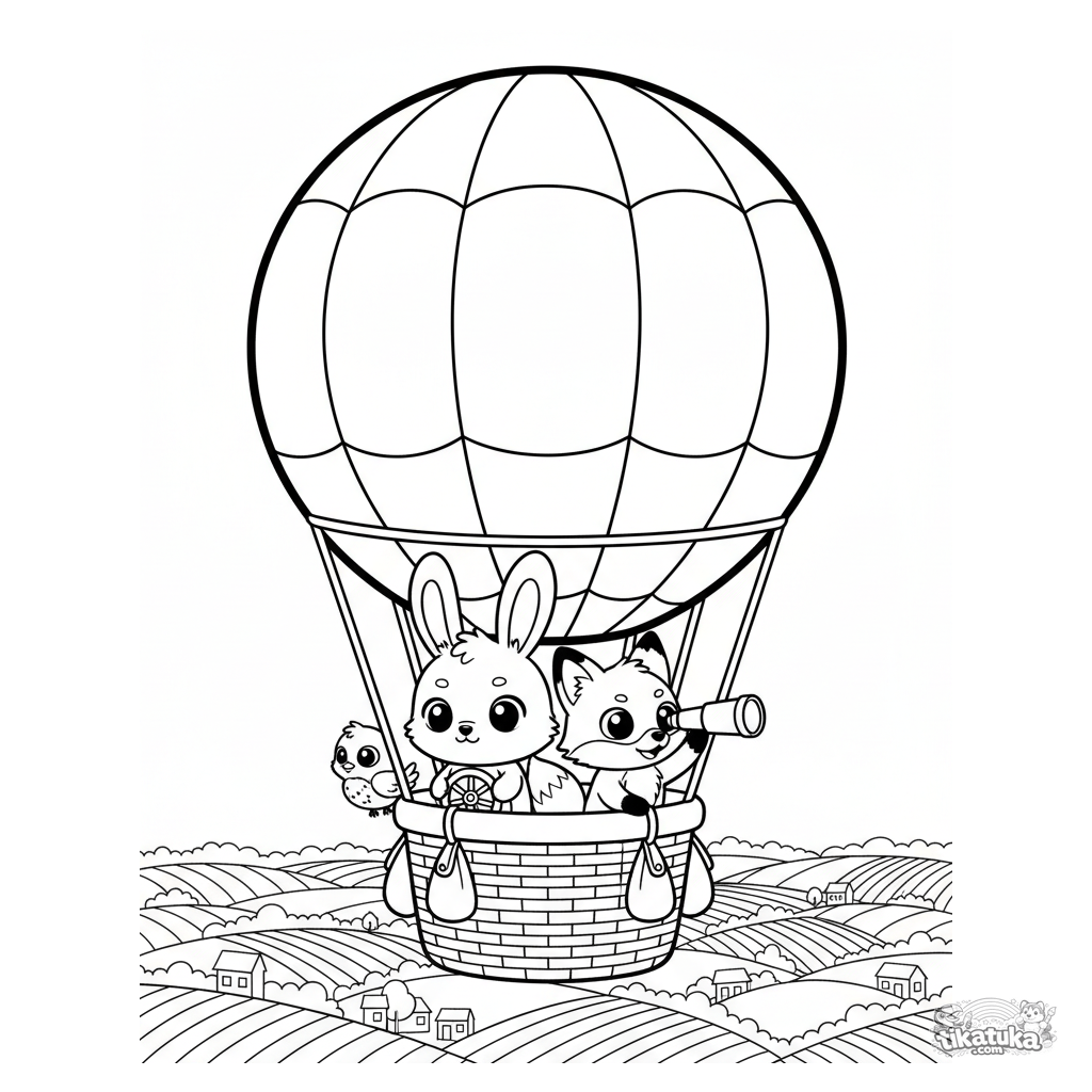 Bright coloring page of a hot air balloon in cute chibi style with animal crew in the basket. For kids aged 4-6. Cheerful characters, clear shapes.