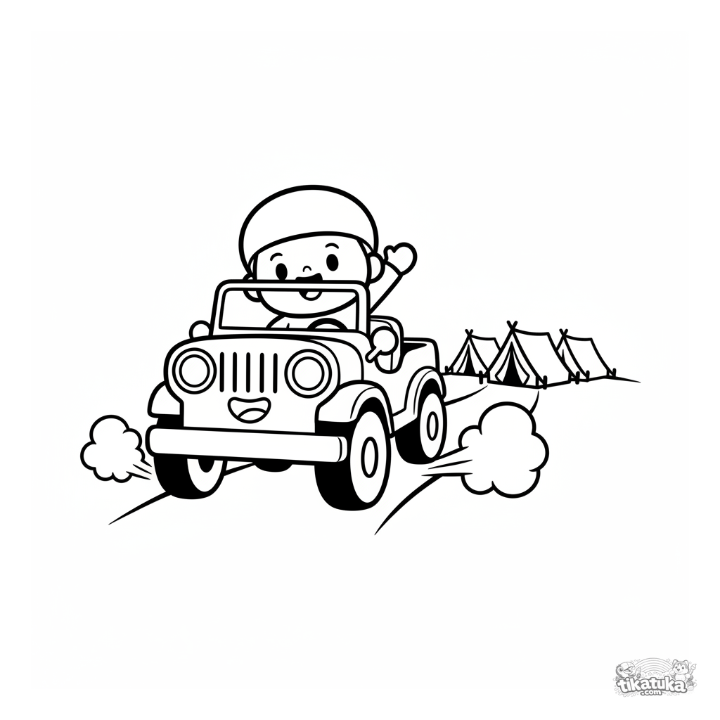Simple coloring page for toddlers 2-3: a cute chibi-style jeep driving towards field tents. Large shapes, few details, wide margins.